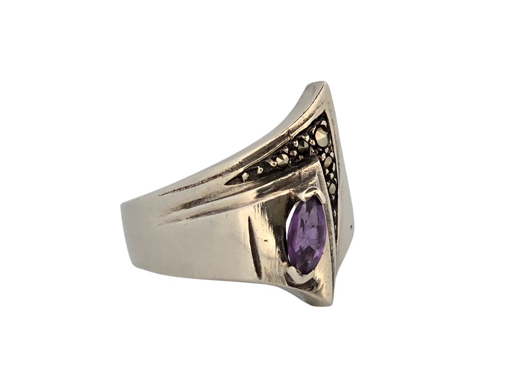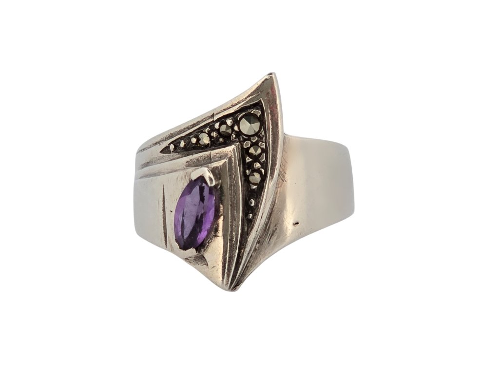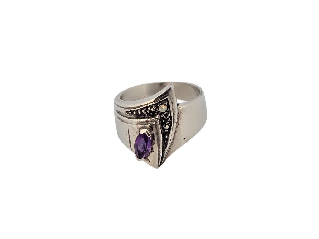 Popis: Výjimečný starožitný stříbrný prsten Art Deco, autorská tvorba, netradiční design. Zdobený centrálním fialovým ametystem a markazity.