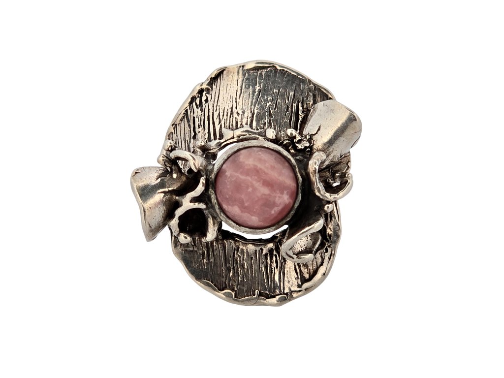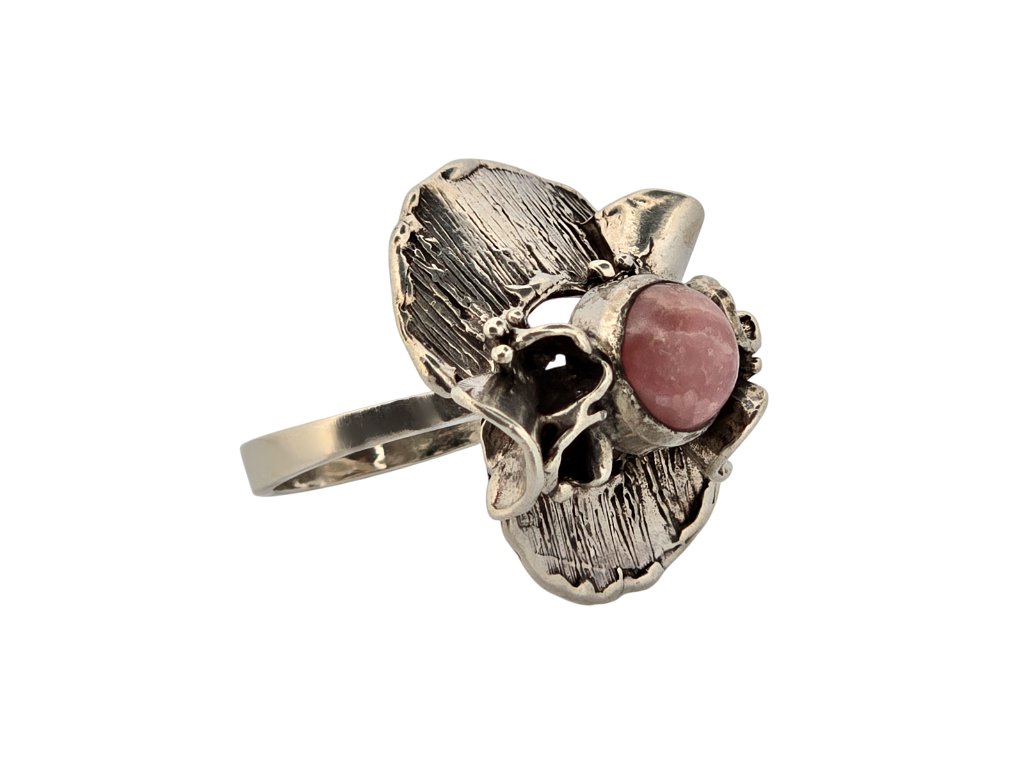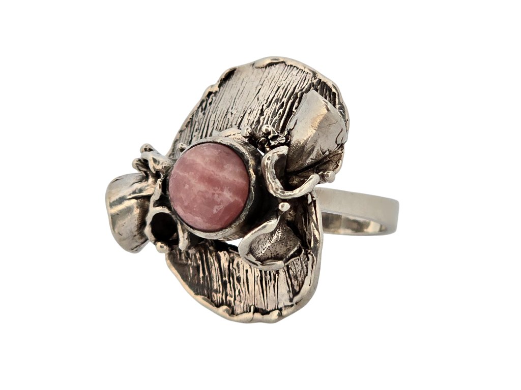 Popis: Výjimečný unikátní autorský prsten ze stříbra, propracované zdobení, s přírodním kamenem - rodochrozitem. Designový šperk.
