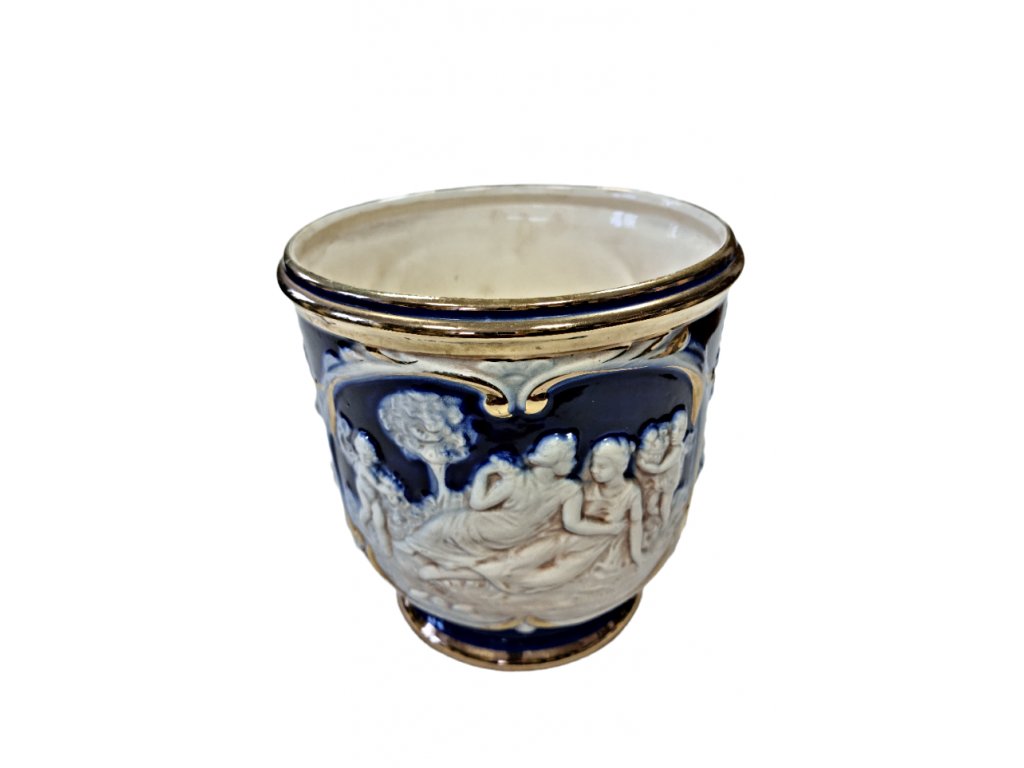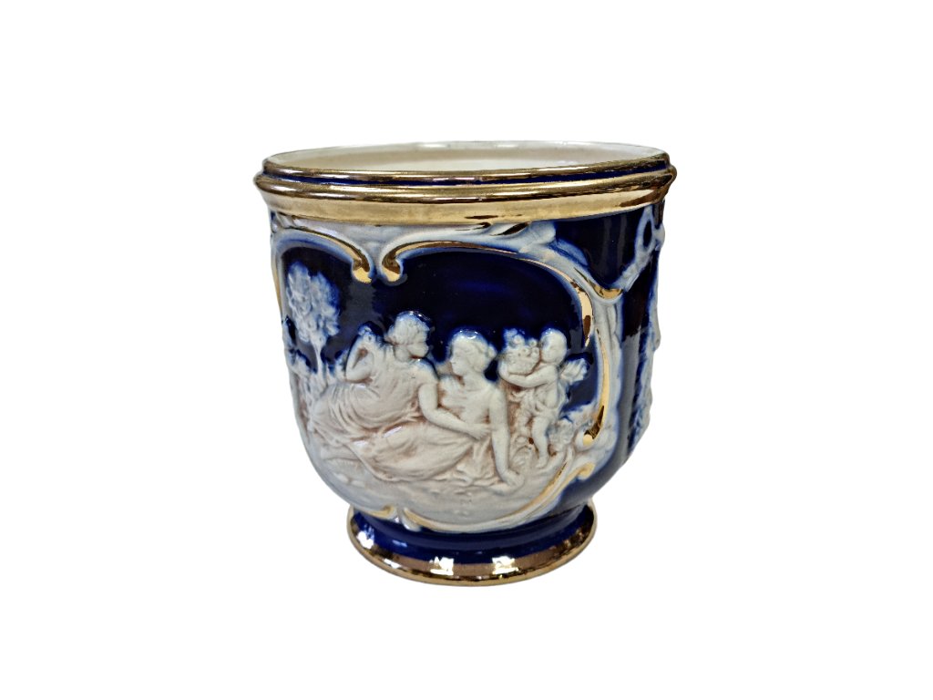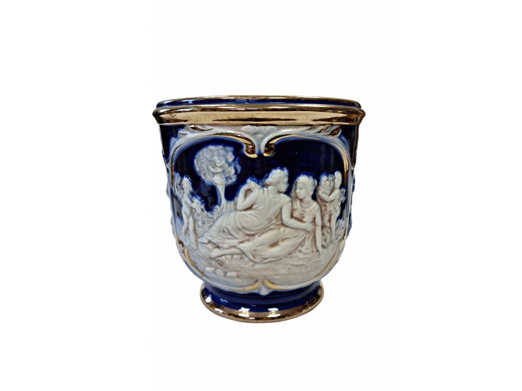 Popis: Květináč modro-bílý, zdobený zlatou likou. Plastický. Keramika.