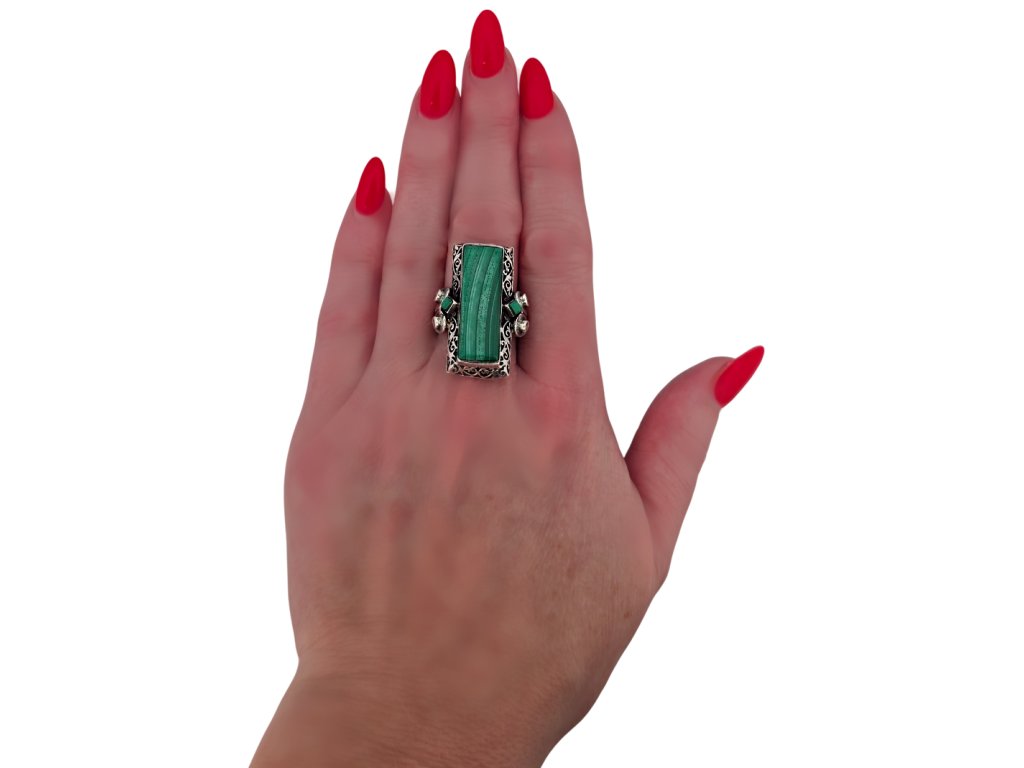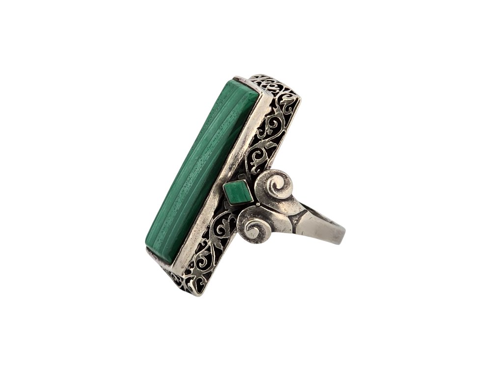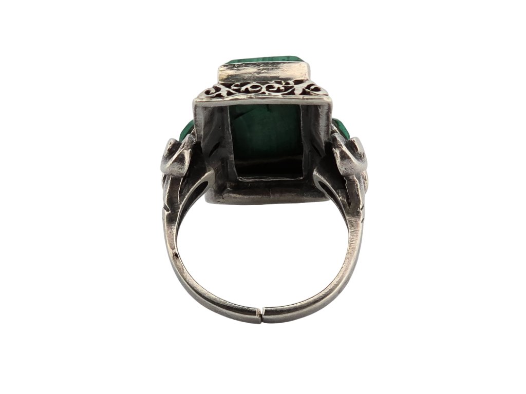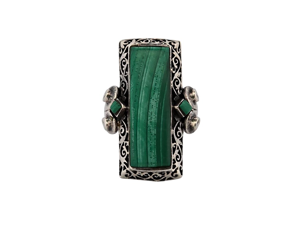Popis: Luxusní masivní art deco starožitný prsten, ze stříbra, zdoben vyřezávanými ozdobnými ornamenty. Vykládaný velkým malachitem a dvěma menšími malachity. Prsten má variabilní velikost (obruba není na pevno - viz foto).