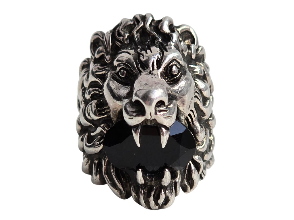 Popis: Luxusní robustní prsten zn. Gucci ve tvaru divoké šelmy. Velmi detailní a propracovaný. V zubech šelma drží broušený obsidián. Obecný kov. Na zadní straně prstenu vyražena signace GUCCI.