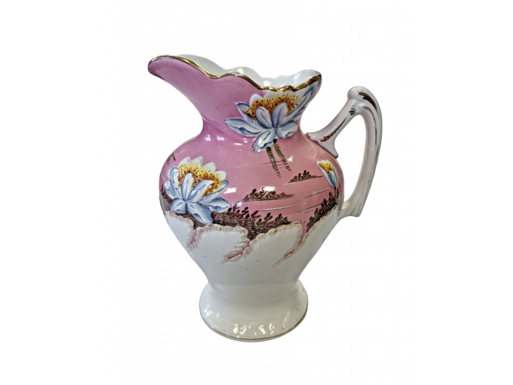 Popis: Džbán porcelánový růžovo-bílý. Malováno, původní zlacení, značeno NIMY Belgie.