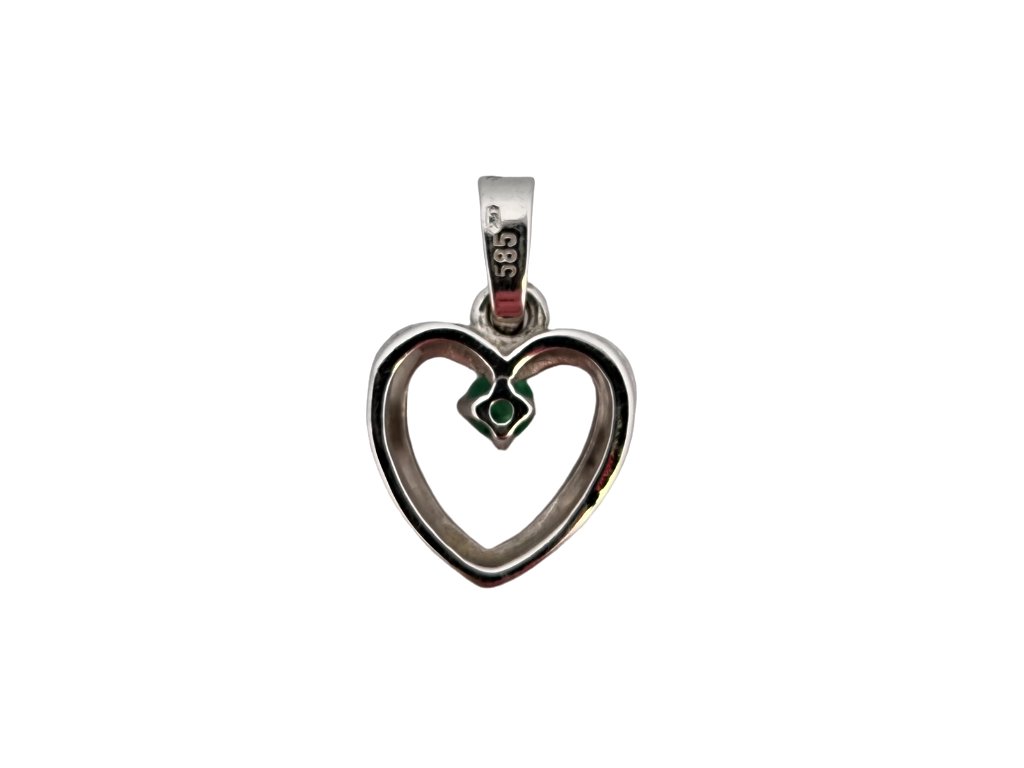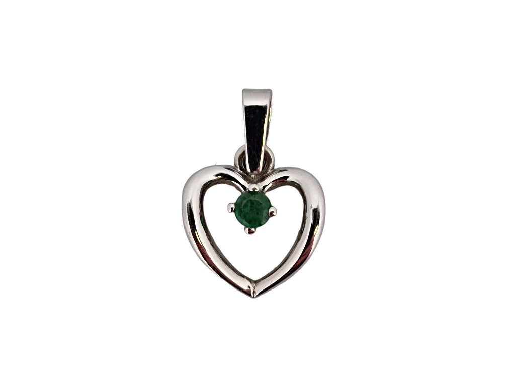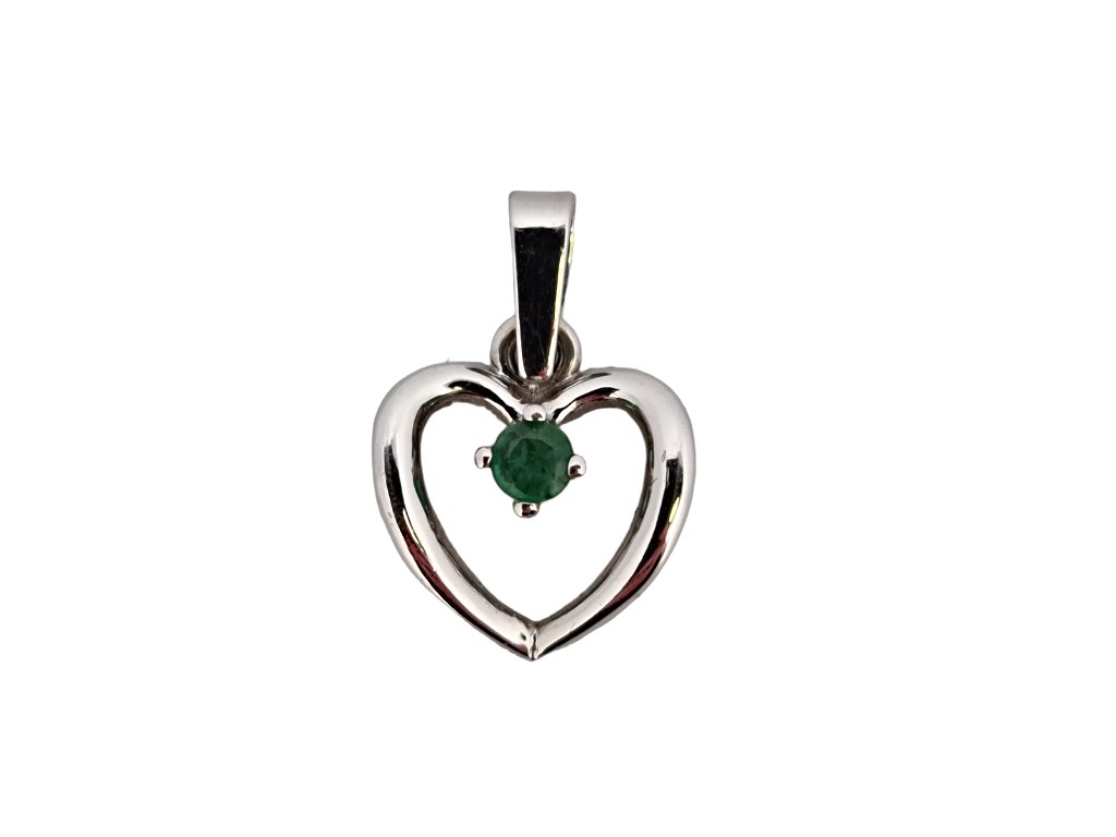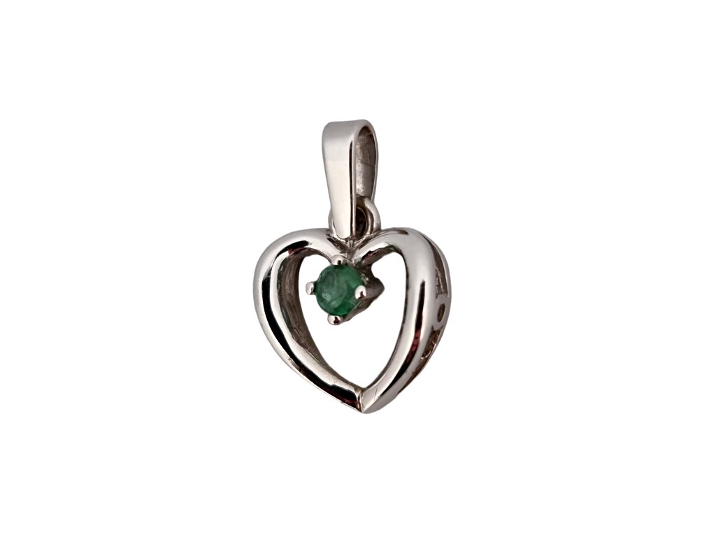 Popis: Přívěsek ve tvaru srdíčka zdobeného smaragdem, bílé zlato.