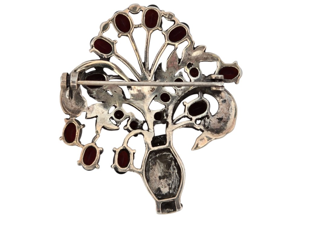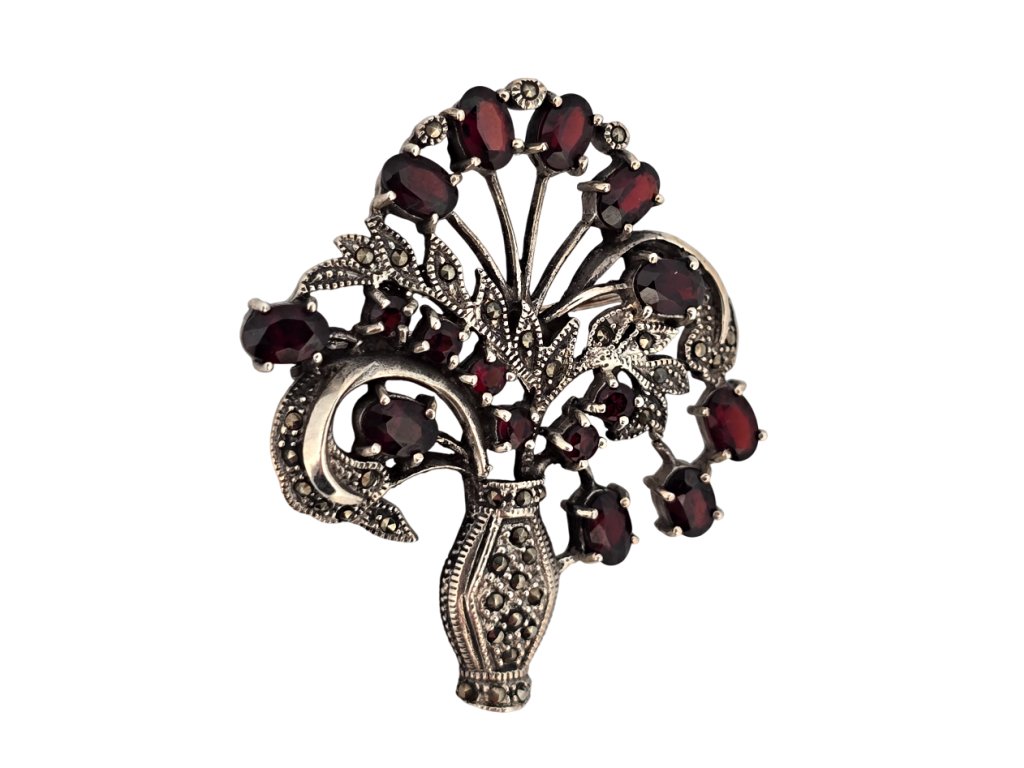 Stříbrná Art Deco brož s granáty - "květinový košíček"