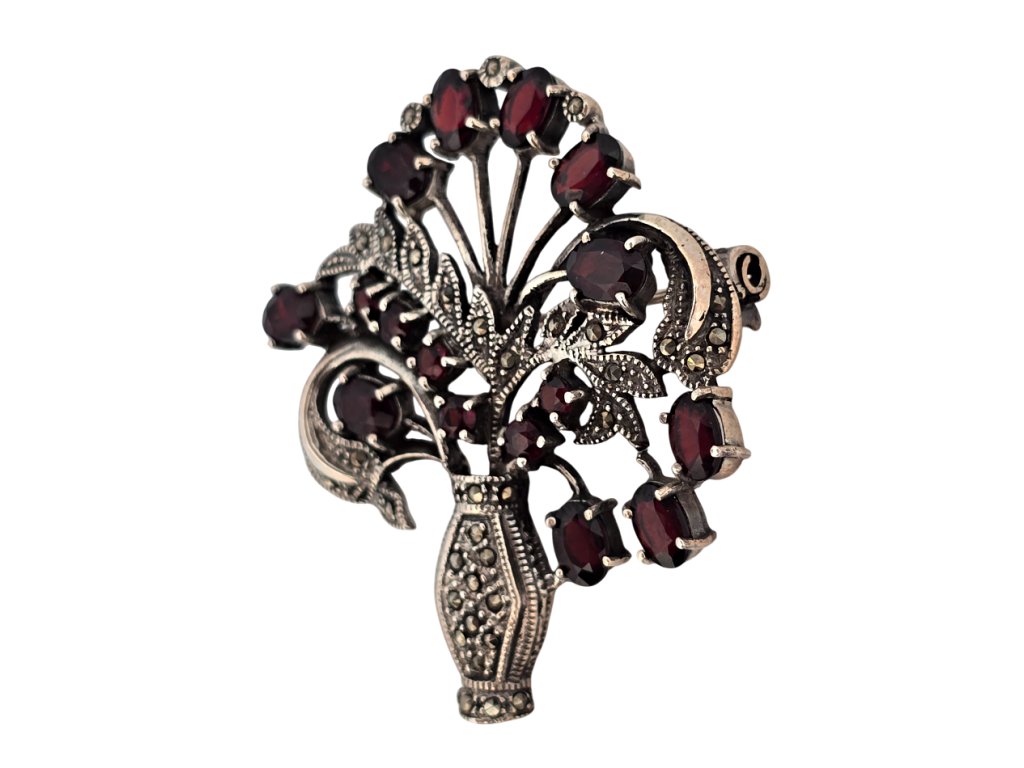 Popis: Luxusní starožitná stříbrná brož, Art Deco, ve tvaru zdobeného košíčku s květinami. Excelentní detailní provedení. Zdobeno přírodními markazity a celkem 16ti kusy přírodních granátů - almandinů. Bezpečností zapínání - plně funkční. Výjimečný šperk.