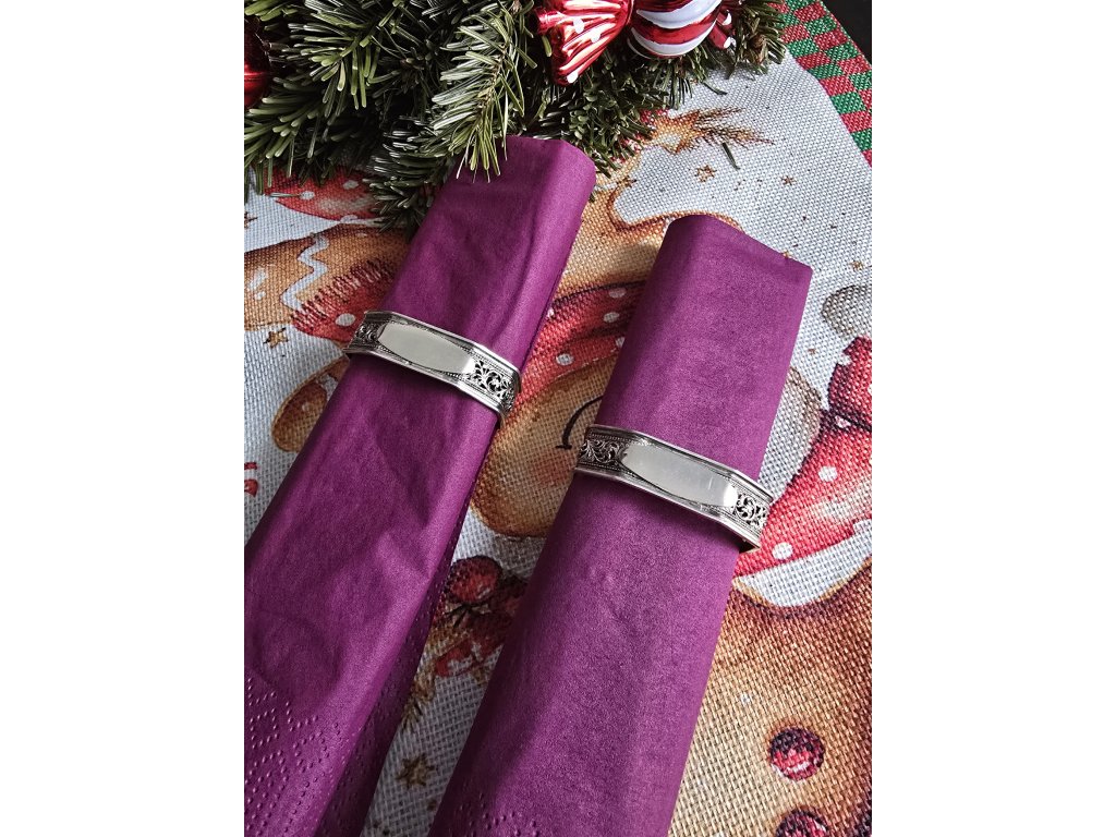 Popis: Dva stříbrné Art Deco kroužky na ubrousky, v původní dochované krabičce. Překrásně prořezávané s hladkou ploškou (vhodná např. na vyrytí iniciálů). Kroužky byly vyrobeny v italském Meranu firmou "Fabbrica Anelli porta fortuna e specialità in oro e argento", což v překladu znamená „Továrna na prsteny přinášející štěstí a speciality ze zlata a stříbra“.