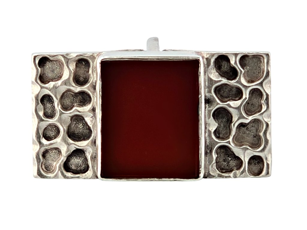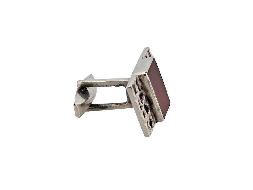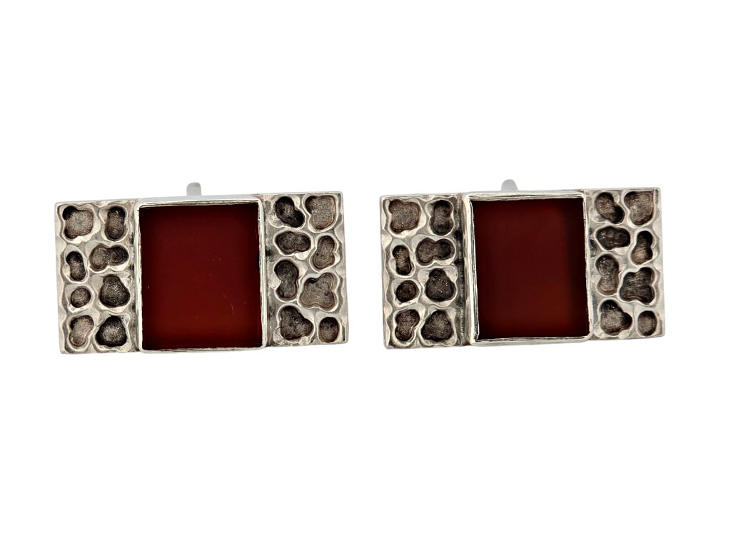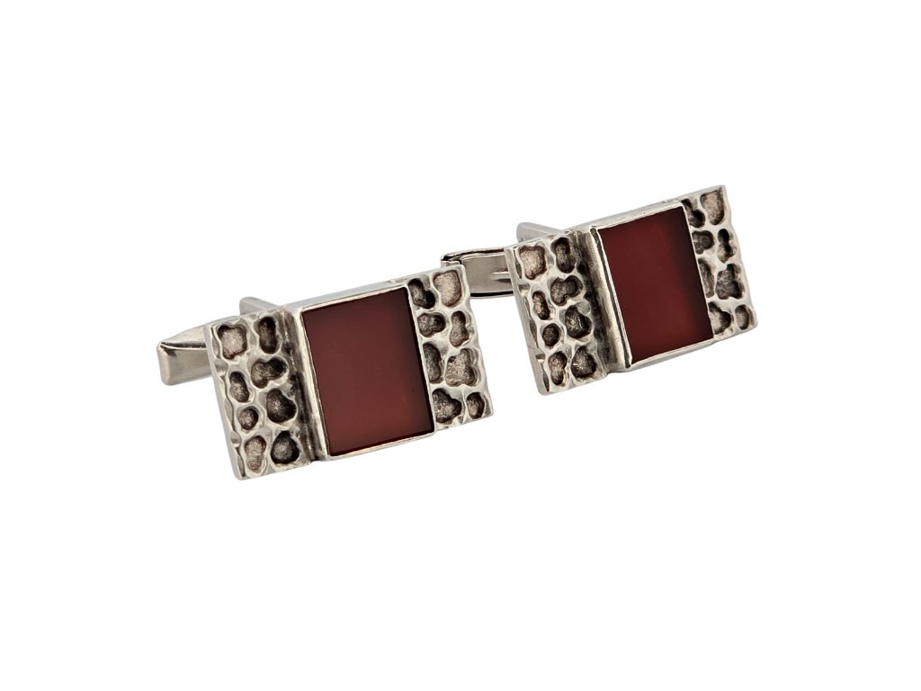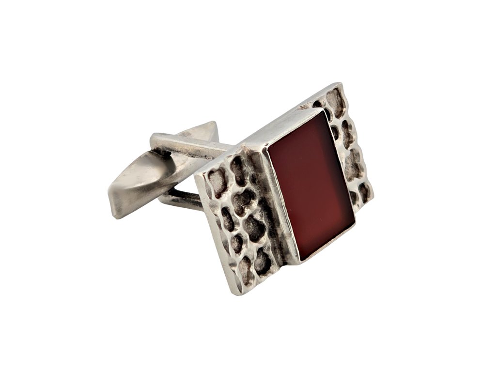 Popis: Stříbrné starožitné art deco manžetové knoflíčky, zdobené a vykládané karneolem. Výjimečný netradiční design.