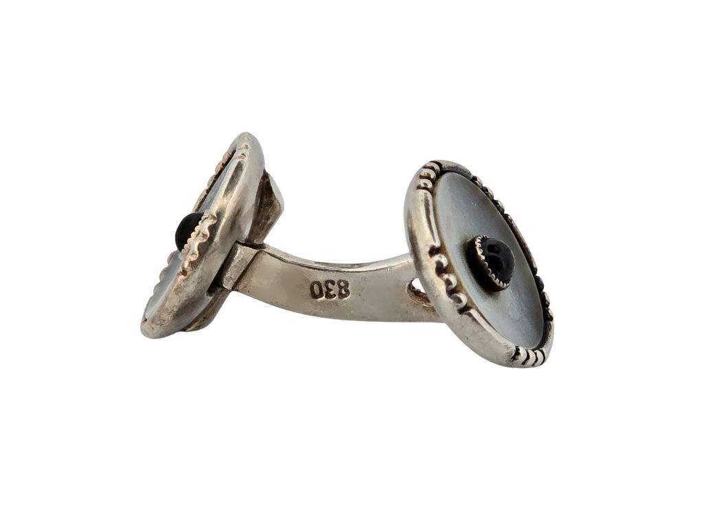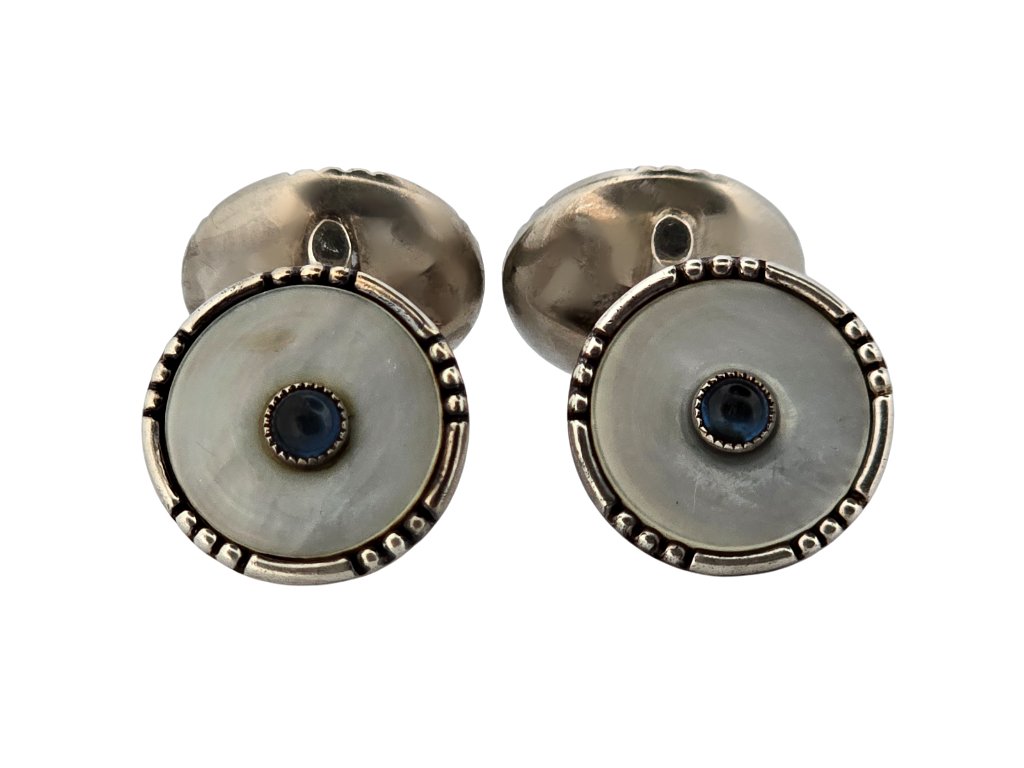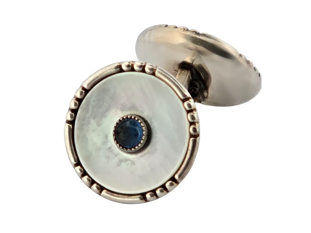 Stříbrné oboustranné manžetové knoflíčky s perletí a safírovým sklem