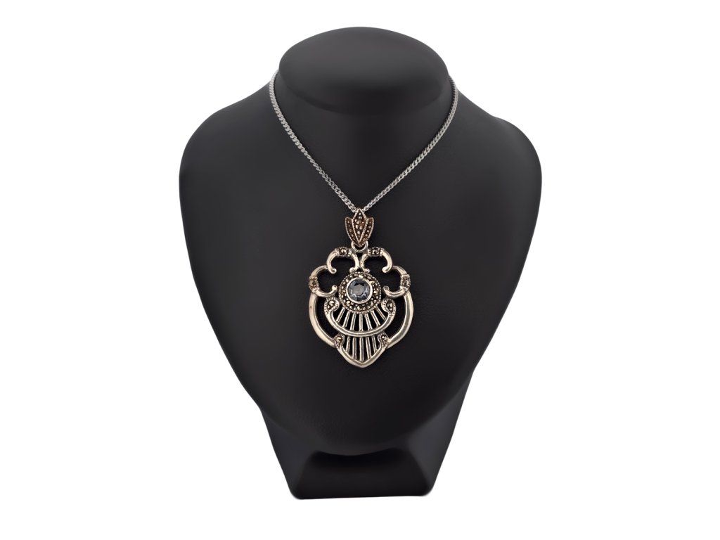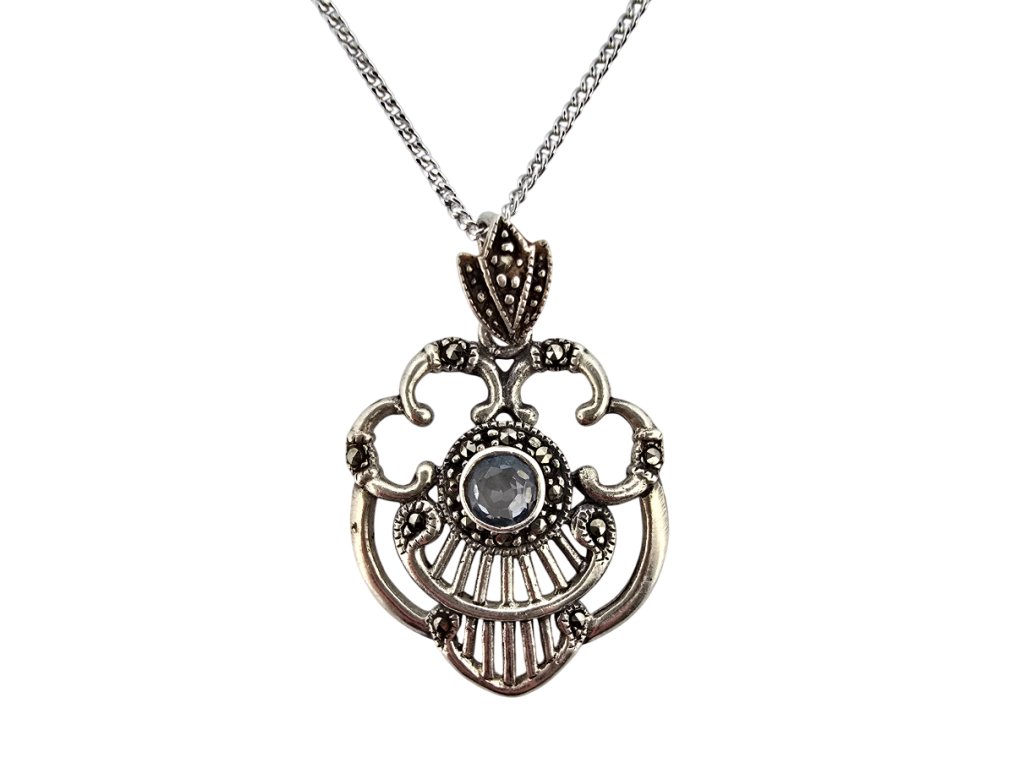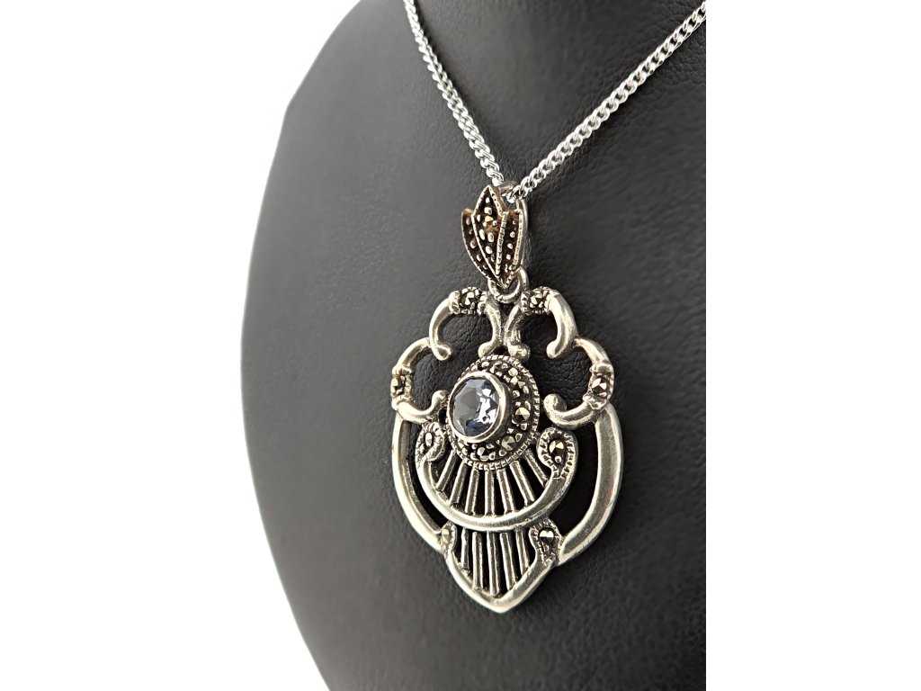 Popis: Stříbrný starožitný art deco náhrdelník (přívěs a řetízek), s typickými art deco tvary, zdobený markazity a centrálním světle modrým syntetickým spinelem. Zapínání klasické - funkční.