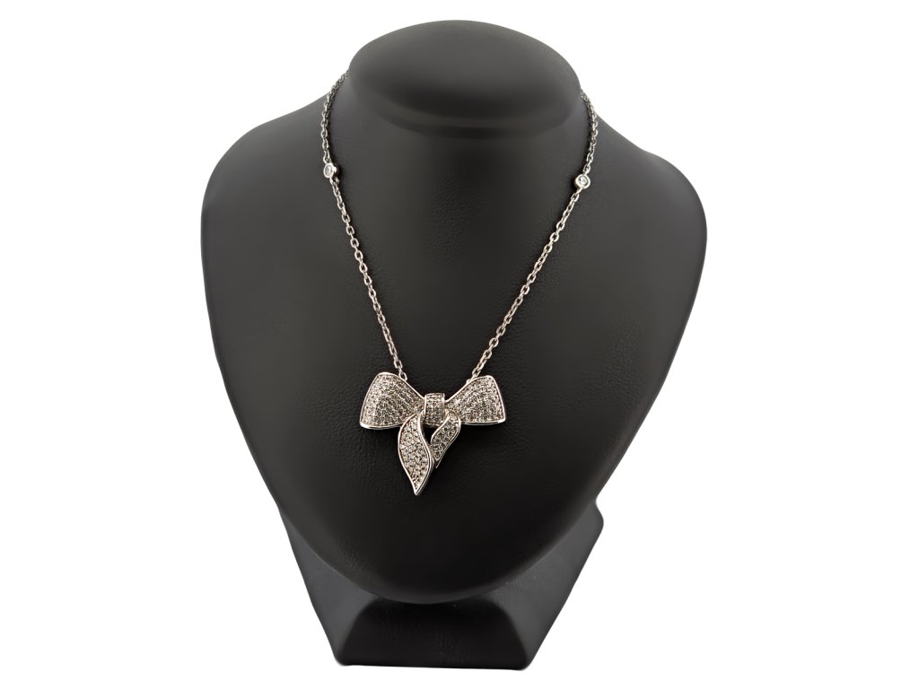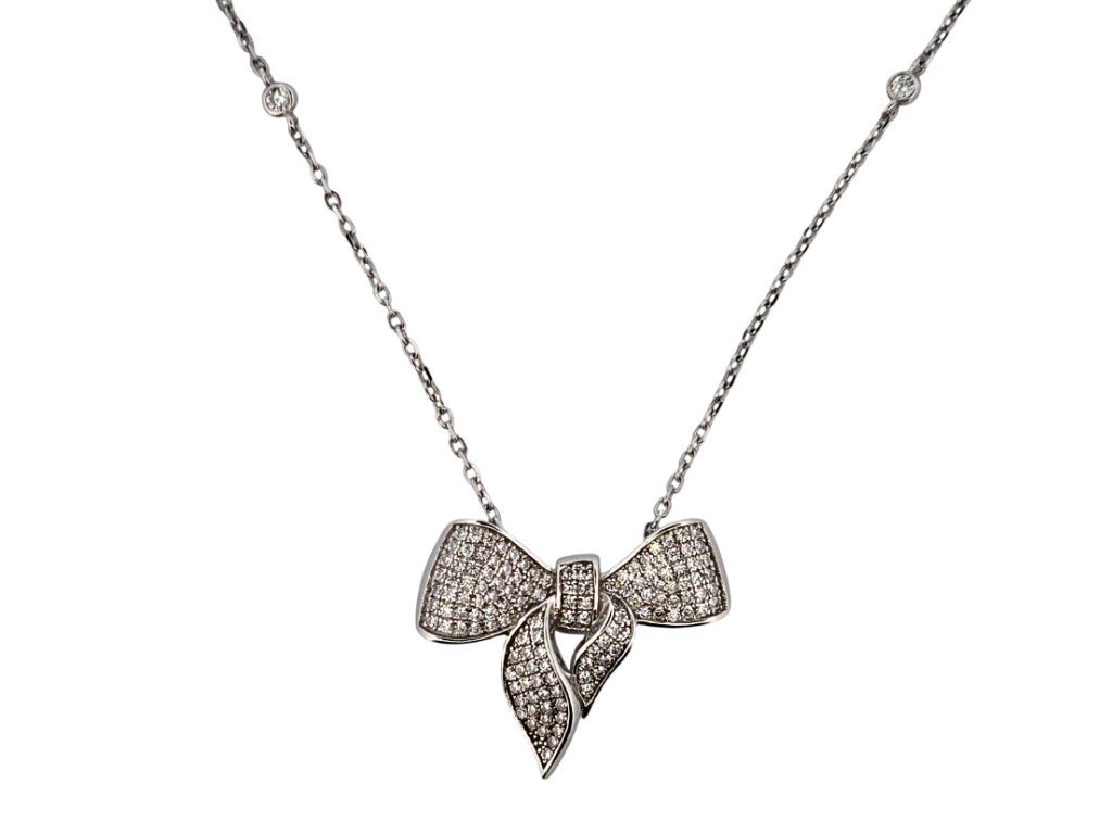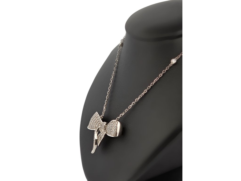 Popis: Stříbrný náhrdelník ve tvaru propracované mašličky, vykladáné čirými zirkony. Na řetízku další dva ozdobné zirkony. Zapínání na karabinu. Délka variabilní.