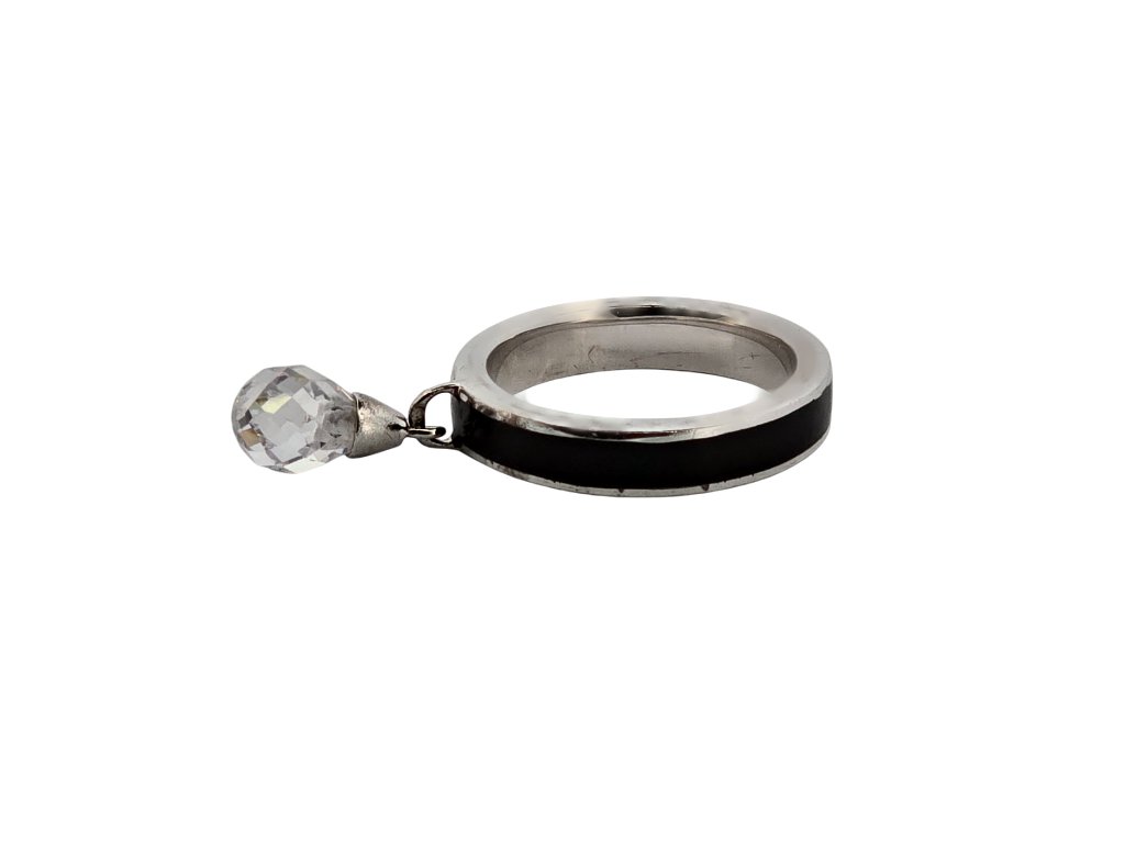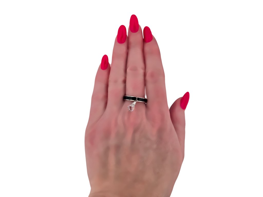 Popis: Velice zajímavý módní prsten s emailovým kroužkem a závěsem ve tvaru broušené kapky z křišťálu. Autorská práce. Signováno.