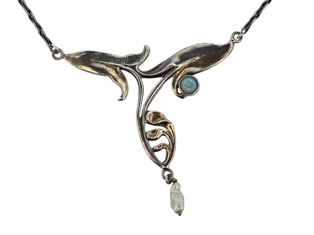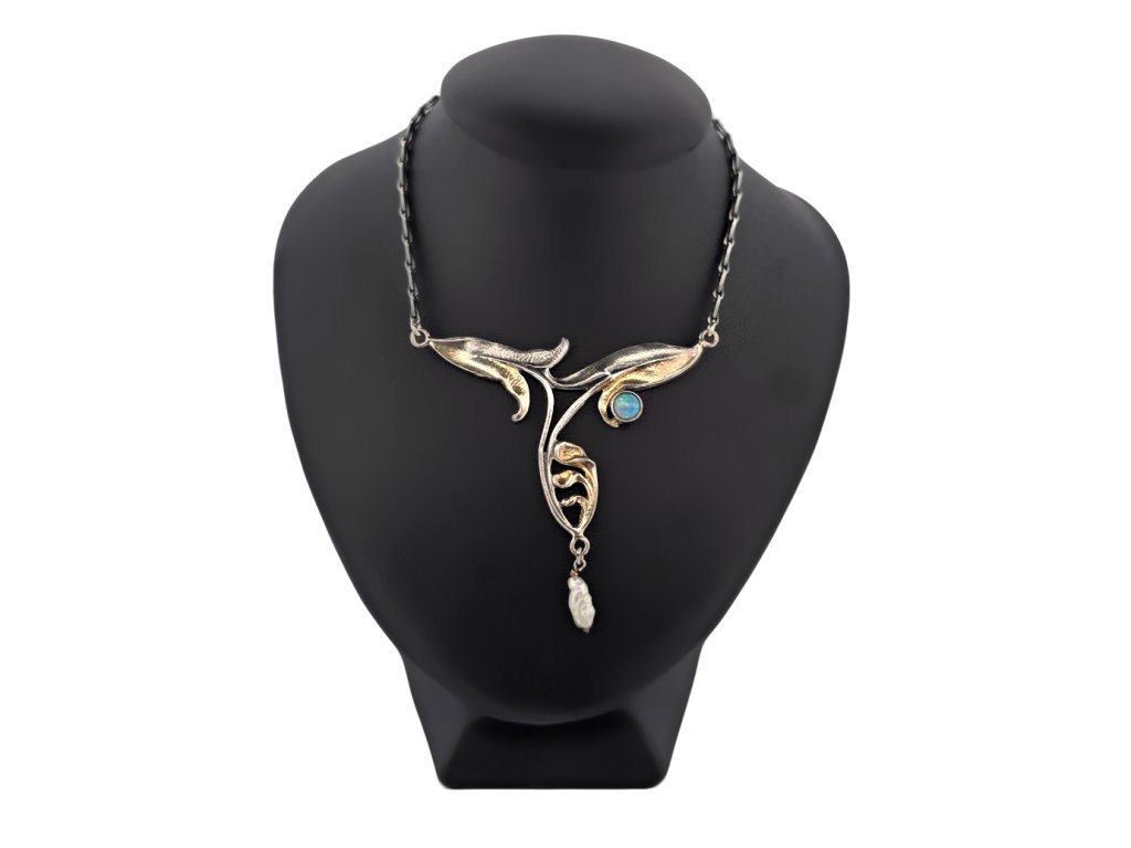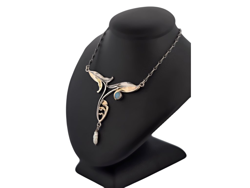 Popis: Stříbrný luxusní náhrdelník, typický secesní design. Zdobený přírodním drahým opálem dobré kvality, o průměru cca 3,8 mm a pěstovanou perličkou, nižší kvality, délky 9 mm. Klasické zapínání. Výjimečný šperk.