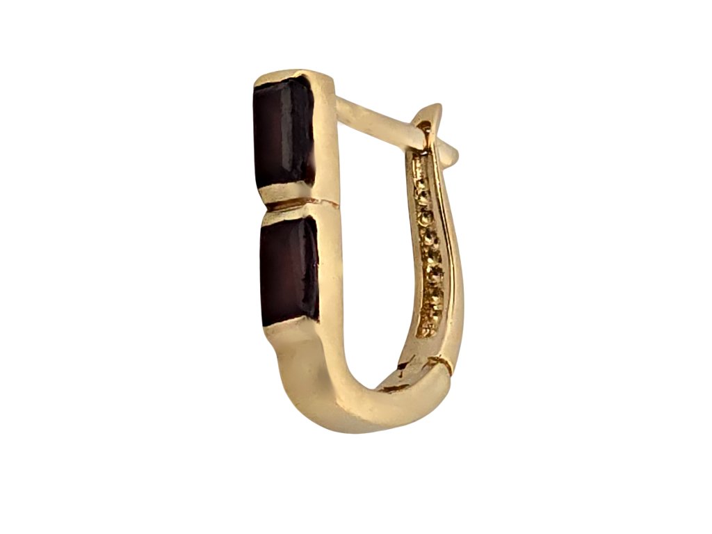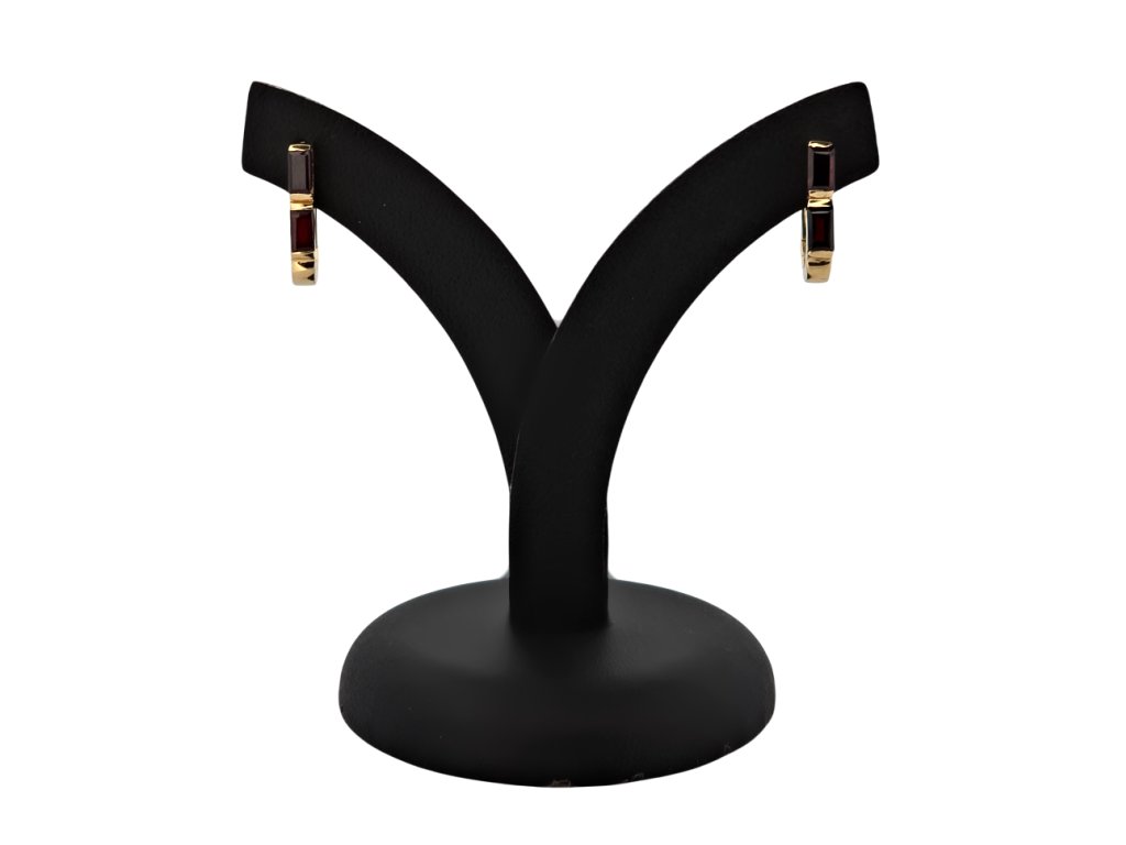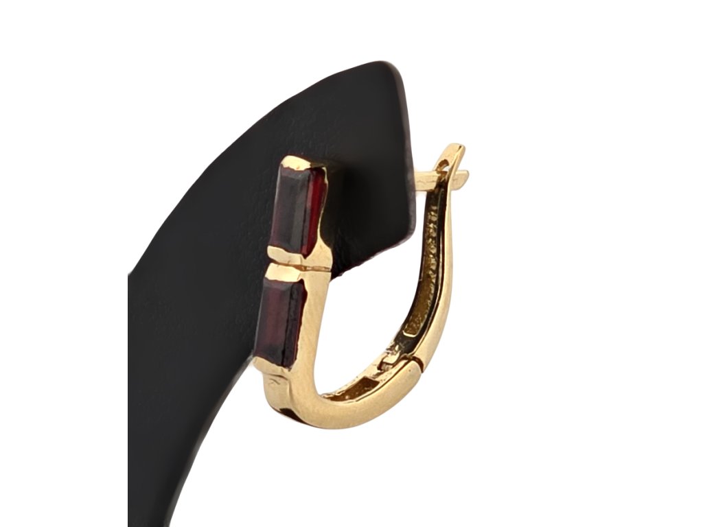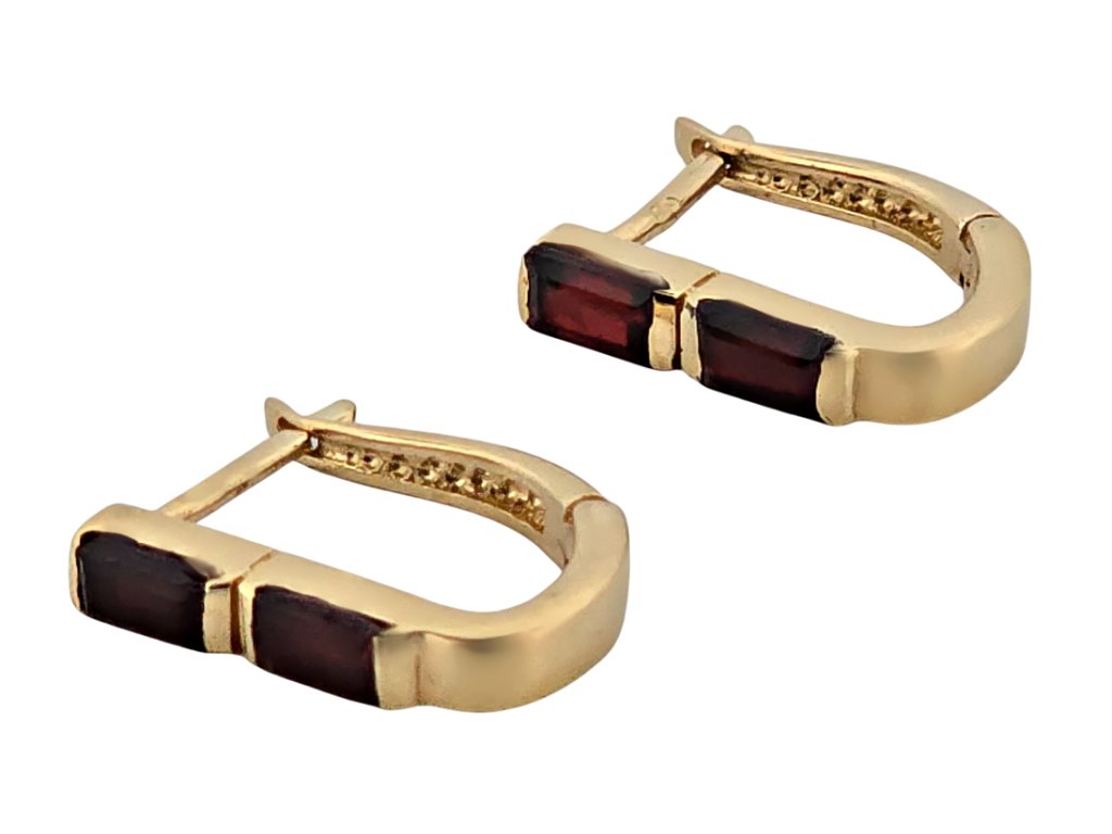Popis: Zlaté elegantní náušnice s přírodními granáty. Na náušnicích jsou celkem 4 kusy granátů (pyralmandinů) obdélníkové tvaru, tzv. brus roháček. Kvalita granátů je dobrá a váha cca 0,96 ct. K náušnicím je znalecký posudek gemologa. Zapínání je francouzský patent.