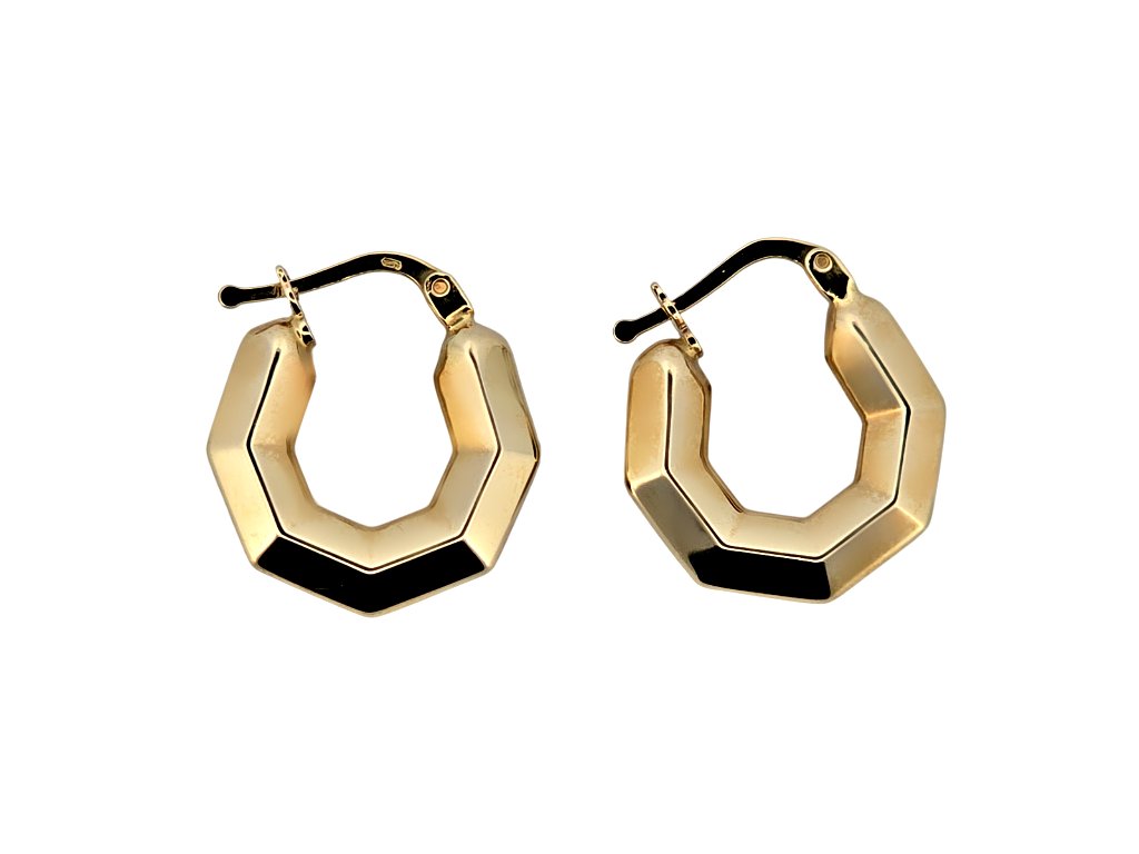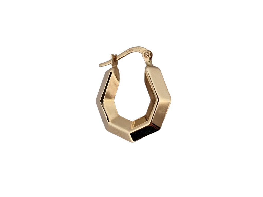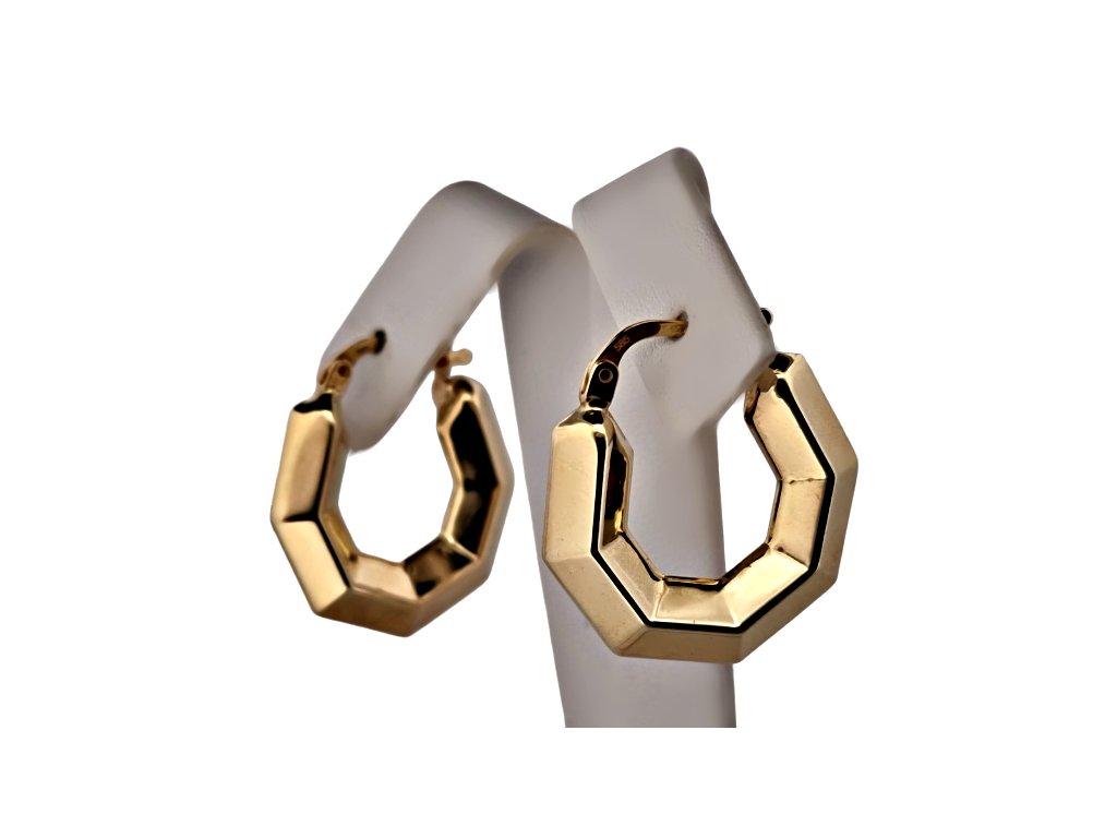 Popis: Zlaté náušnice masivního vzhledu, ve tvaru sekaného kruhu. Zapínání na francouzský zámek.