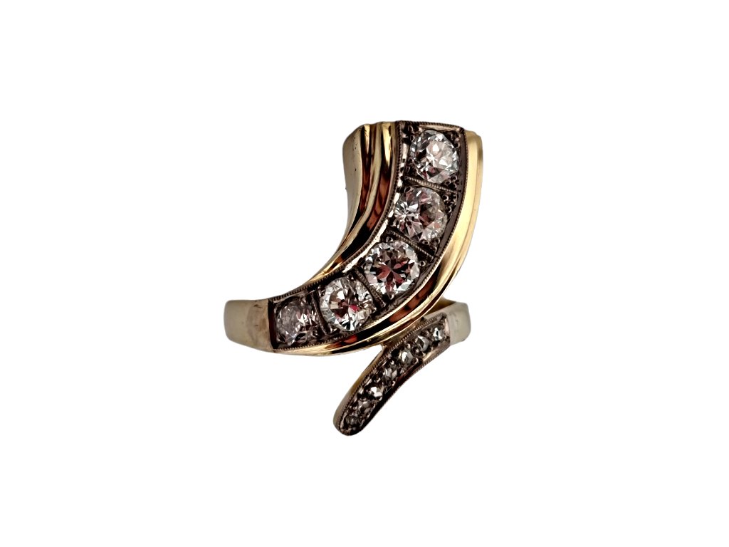 Popis: Zlatý Art Deco masivní prsten extravagantního designu s diamanty. Celkem 11 kusů diamantů (briliantového brusu a kulaté routy), kvality velmi dobré až dobré, o celkové váze cca 0,98 ct. Na vnitřní straně nápis HANDARBEIT (ruční výroba).