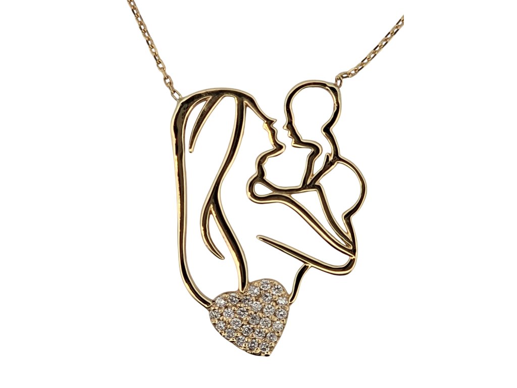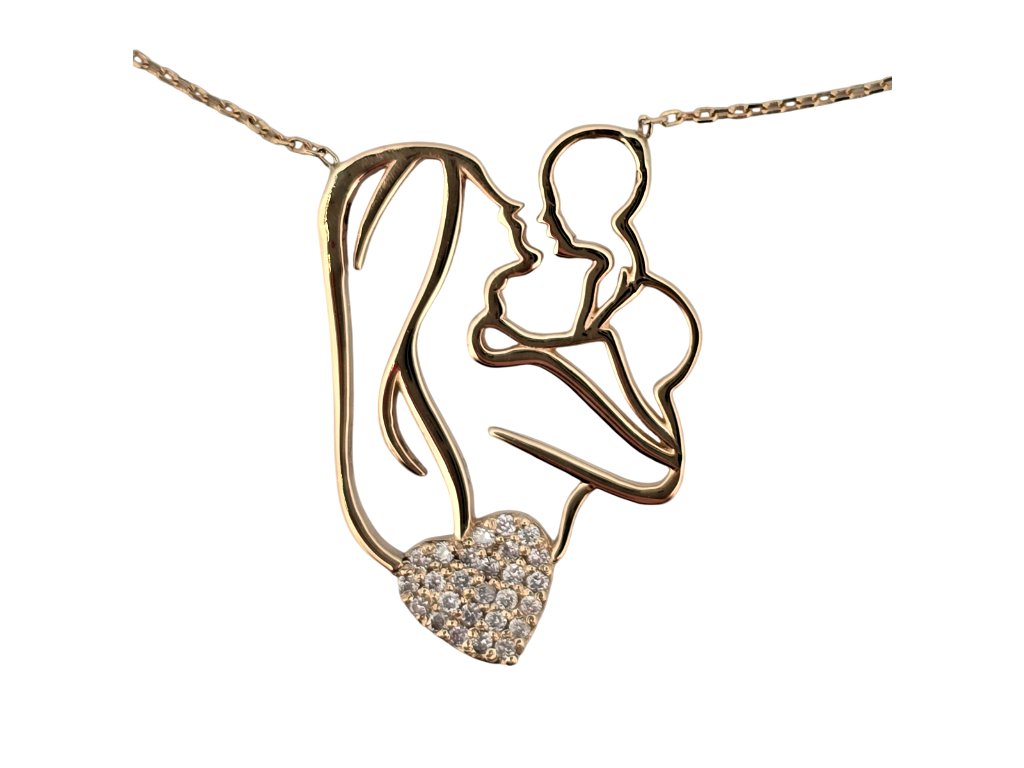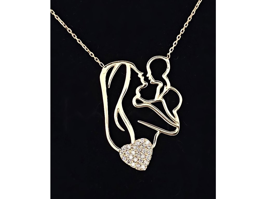 Popis: Zlatý výjimečný emotivní náhrdelník znározňující maminku a její děťátko, doplněný srdcem vykládaným diamanty. Na náhrdelníku je celkem 27 kusů přírodních diamantů, kulatého briliantového brusu. Kvalita diamantů je velmi dobrá a celková váha je cca 0,14 ct. Zapínání náhrdelníku je klasické, plně funkční. Jedná se o výjimečný šperk, vhodný jako dárek za porod, k narození miminka, ale i jako dárek dcery či syna své mamince.