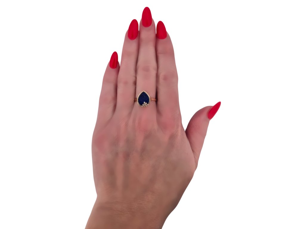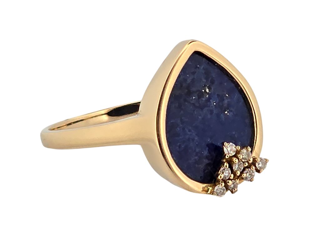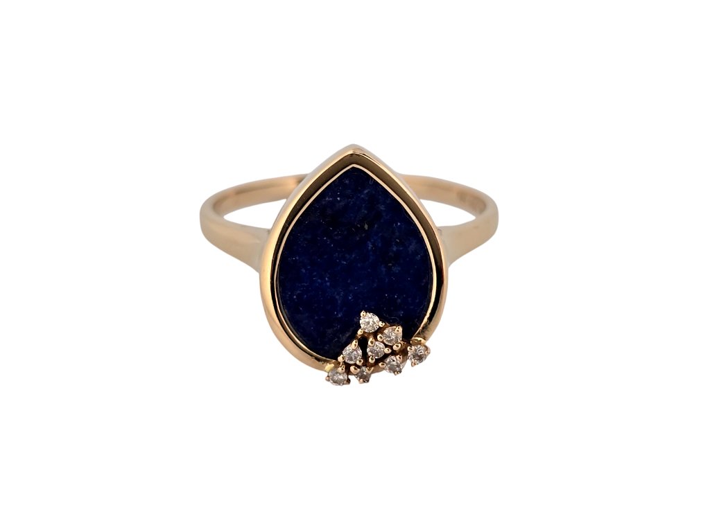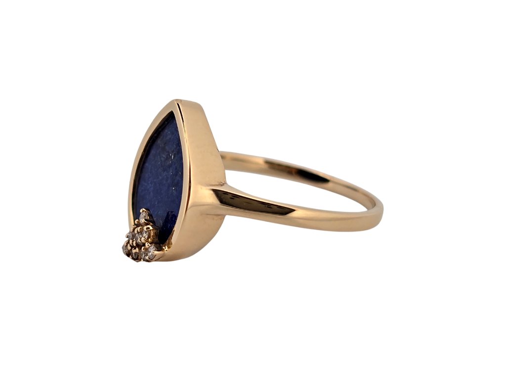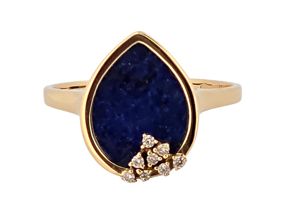 Popis: Výjimečný zlatý prsten z 18ti karátkového zlata, s přírodním kamenem lapis lazuli, zdobený přírodními diamaty. Lapis lazuli je znám jako výjimečný kámen již ze starého Egypta, jako kámen Bohů. Je zajímavý svou jasnou tmavou modří s jemnými zlatými žilkami. Rozměr lapisu je cca 12 x 9 x 1,54 mm a jeho kvalita je velmi dobrá. Dále je na prstenu 8 kusů přírodních diamantů, briliantového brusu, velmi dobré kvality, o celkové váze cca 0,04 ct. Luxusní netradiční šperk.